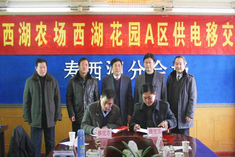 仪式上,寿西湖农场和寿县供电公司双方签定了《西湖花园A区配电资产移交协议》,标志着西湖花园电力系统整体移交寿县供电公司管理。(王家宇)