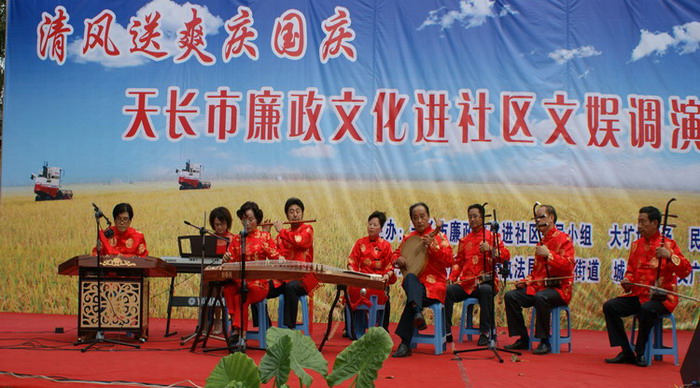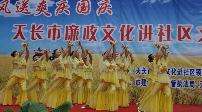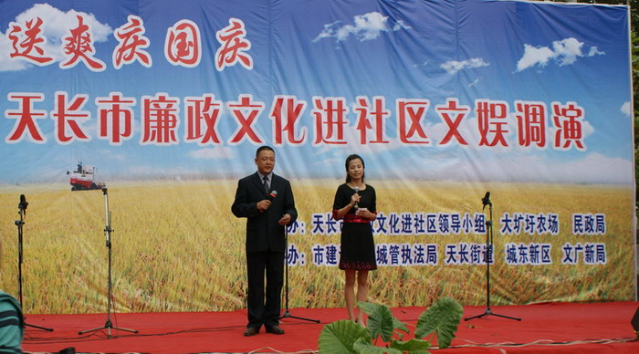 928,安徽农垦大圹圩农场休闲广场欢歌笑语,人头攒动,热闹非凡。由天长市廉政文化进社区领导小组、大圹圩农场、天长市民政局联合主办,天长市相关部门协办的清风送爽庆国庆——廉政文化进社区文艺调演活动正在这里举行,热烈的气氛,精彩的节目,吸引了数百名群众观看。大圹圩农场场长汪登松、天长市廉政文化进社区领导小组负责人分别登台致辞。