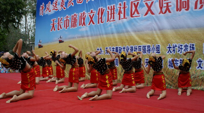近年来每逢重大节日,大圹圩农场除自主开展各类文体娱乐活动之外,还采取“请进来、走出去”的方式,加强与社会各界合作交流,促进安徽农垦集团建设,丰富职工群众精神生活。为迎接建国62周年和九九重阳节的到来,推进垦地廉政文化建设,营造崇廉尚廉的社会风尚,农场社区牵头与天长市廉政文化进社区领导小组联系,在国庆前共同举办了此次文艺调演活动。