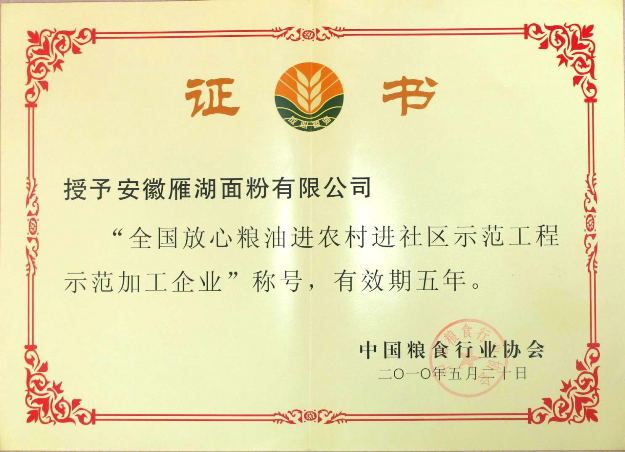 安徽雁湖面粉公司荣获“全国放心粮油示范加工企业”称号