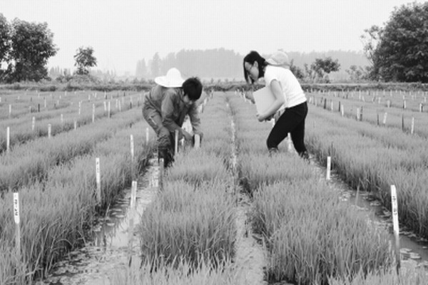 图为622日,大圹圩农场皖东农科水稻育种技术员在试验田里调查小秧苗叶龄、苗情、病虫害和水浆管理情况。(农民日报2015629 05 版,李炳旺 夏庆芳摄)