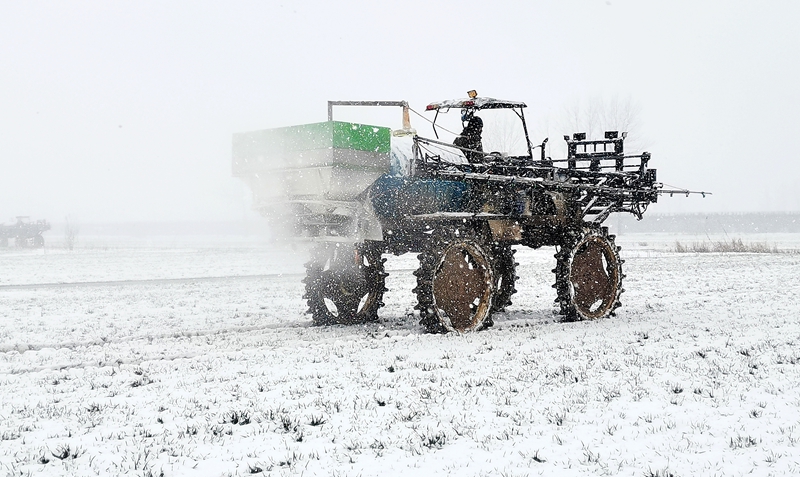 2月24日,龙亢农场公司组织职工利用高地隙植保机在五河县头铺镇托管田块开展追施小麦返青肥作业。薛勇  摄