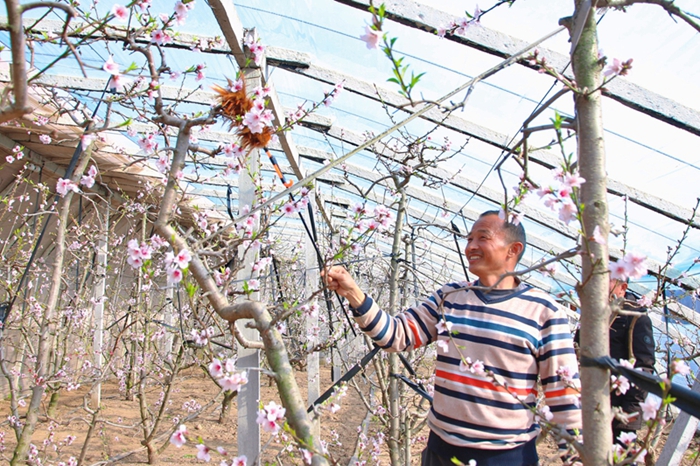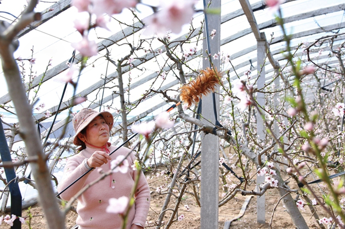 早春时节,砀山果园场公司近1000亩大棚桃花盛开,正是大棚桃花授粉的关键时期,职工正抢抓农时,为桃花授粉。农技人员深入大棚果园现场了解棚内温度、湿度,讲解人工授粉技巧,并引导果农采用生物防虫、防病技术,提高油桃坐果率和果实品质,提升果树的经济效益。郭茜 供稿