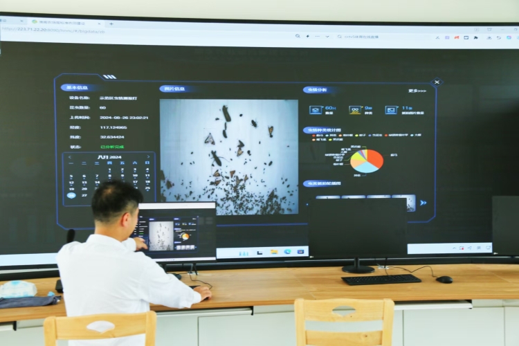 赵锐边演示边介绍,数字农业综合管理云平台,最突出的表现是病虫害治理。在智慧区田块配备有高精度摄像头,能够24小时不间断捕捉农田虫害影像,虫情监测灯设备能够自动识别并分类各种害虫,精确度达95%以上。实时的数据分析结果,通过物联网技术即时上传至云端,通过云平台进行统计分析处理,绘制出农田虫害分布图,分析害虫活动规律及发展趋势,精确发布监测预警,精准定位虫害区域,农场公司农科所根据分析结果,制定出针对性的病虫害防治方案,使病虫害防控工作变得精准而高效。