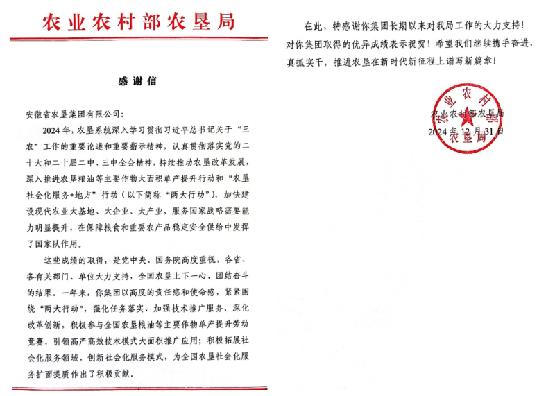 2025年元旦前夕,安徽省农垦集团收到农业农村部农垦局的感谢信。信件对安徽农垦围绕农垦粮油等主要作物大面积单产提升行动和“农垦社会化服务+地方”行动(简称“两大行动”)、加快建设现代农业大基地、大企业、大产业(简称“三大建设”)等方面取得的优异成绩提出表扬,并表示感谢。