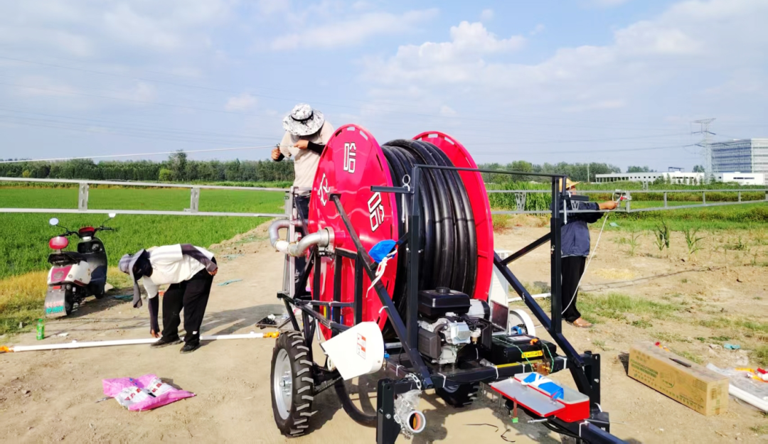 工作人员正在调试自走式喷灌机。