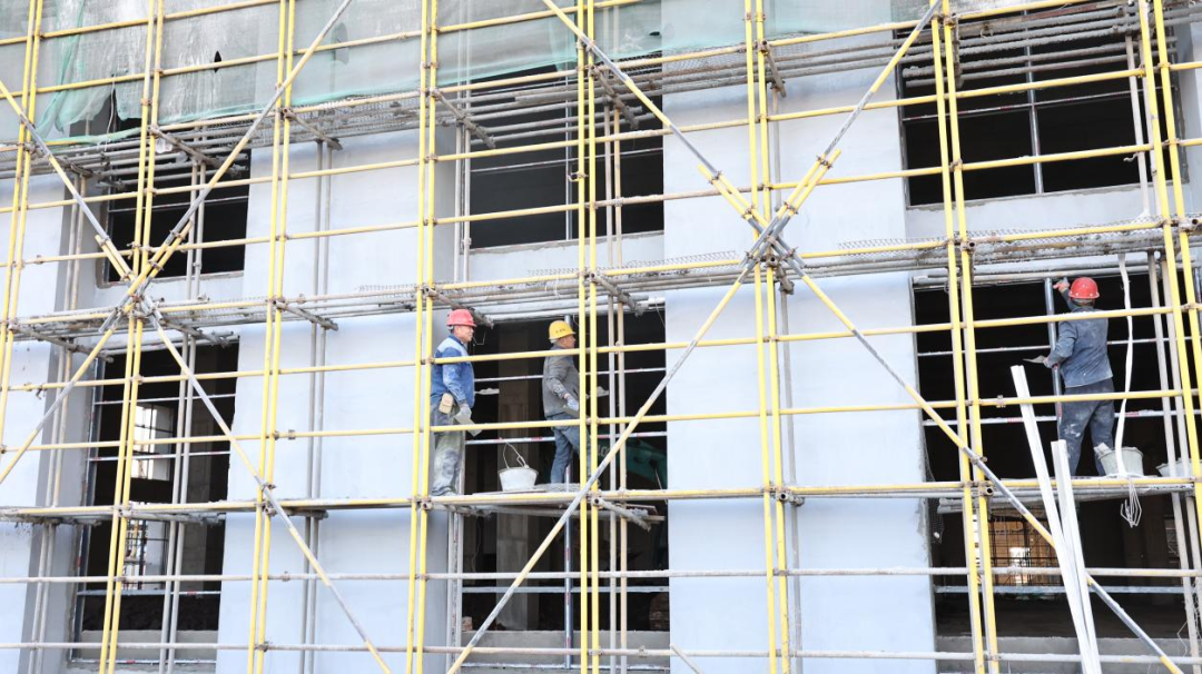 施工人员正在粉刷厂房外立面