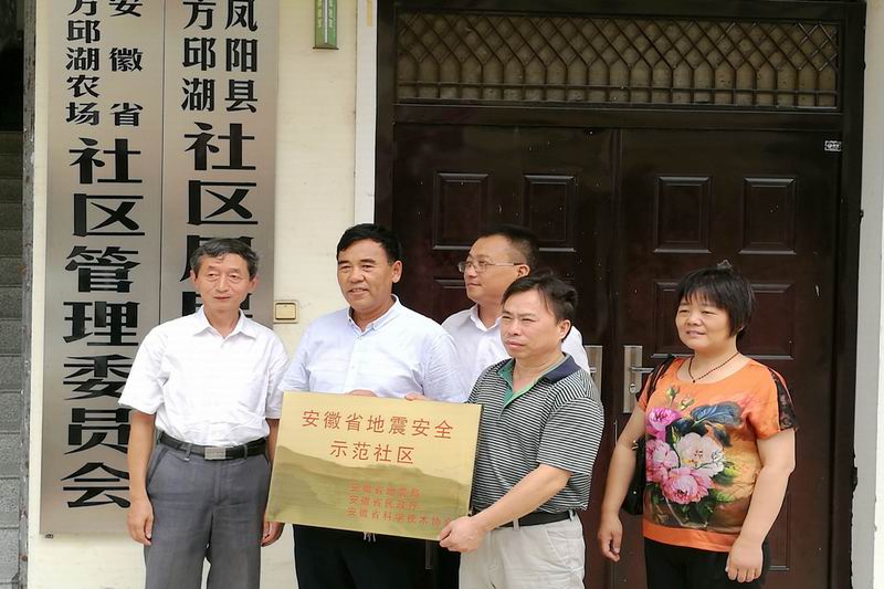 810,凤阳县科技局薛金宝局长一行来到方邱湖农场,代表省地震局、民政厅、科协进行安徽省地震安全示范社区授牌。