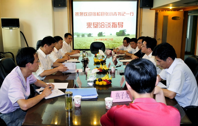 721下午,宿松县委书记张小青率县委副书记罗成圣、副县长黄毛怀及有关部门负责人来到省农垦集团,就深化垦地合作、共建工业园区及加快推进华阳河农场融入宿松县经济社会发展规划与省农垦集团及华阳河农场进行了洽谈,省农垦集团副总经理程军出席会议,华阳河农场场长唐邦水、集团公司土地建设规划部有关负责人、参加了会议。