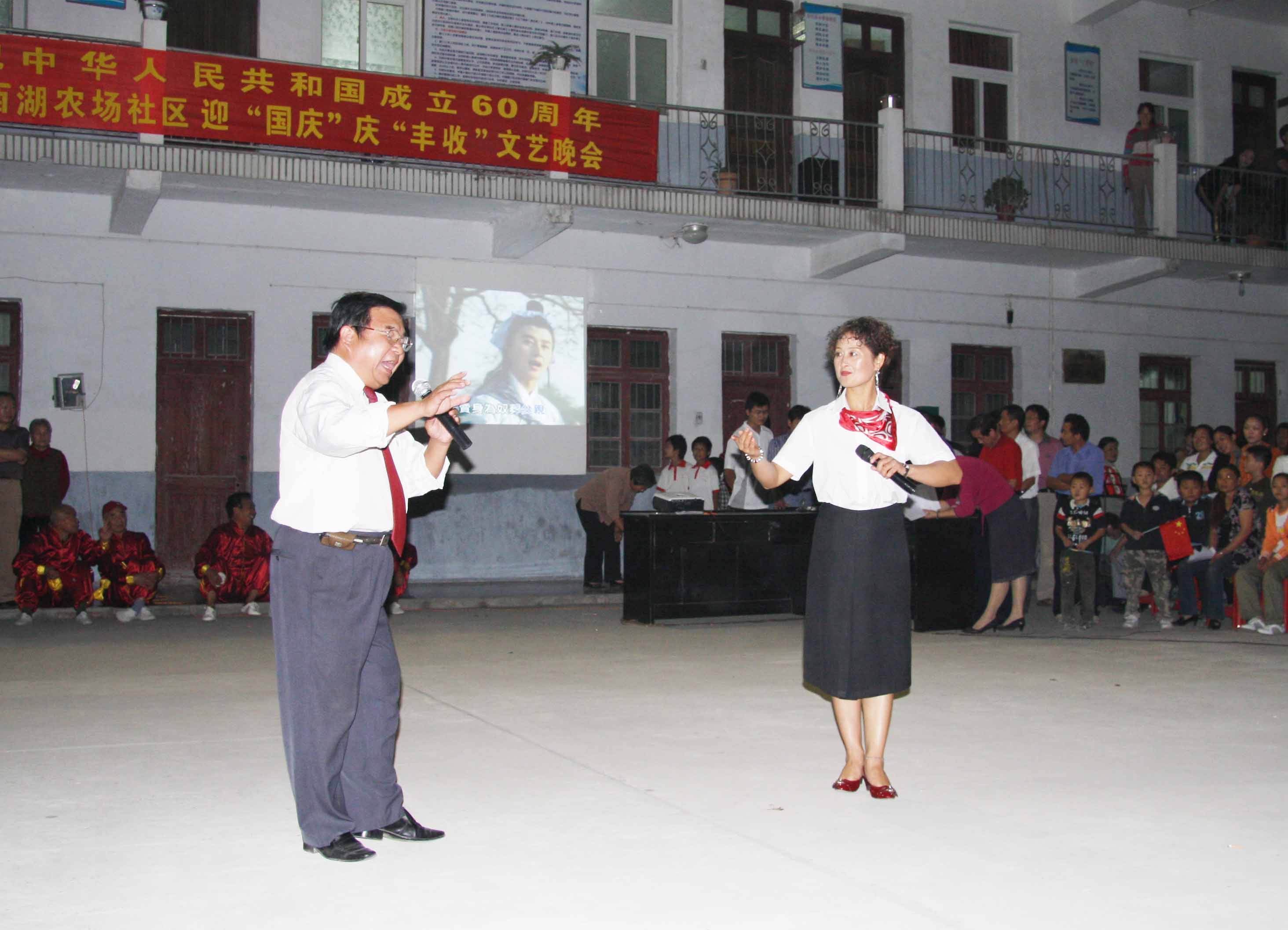 930日晚上,寿西湖社区文体广场灯火通明,热闹非凡,洋溢着欢乐喜庆的气氛,庆祝中华人民共和国成立60周年暨寿西湖社区迎“国庆”庆“丰收”文艺晚会在此隆重举行。社区“两委”领导亲临现场与社区居民一道观看演出。社区管委会主任王苏平同志在晚会上致辞,向广大社区居民致以节日的祝贺和热烈的欢迎!