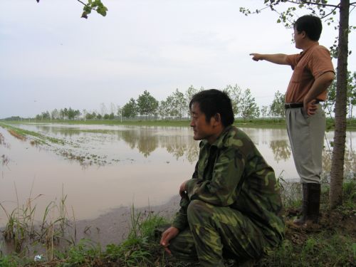 图为潘村湖农场二分场职工李家军兄弟在自家责任田前察看涝情。(杨登宏摄)
