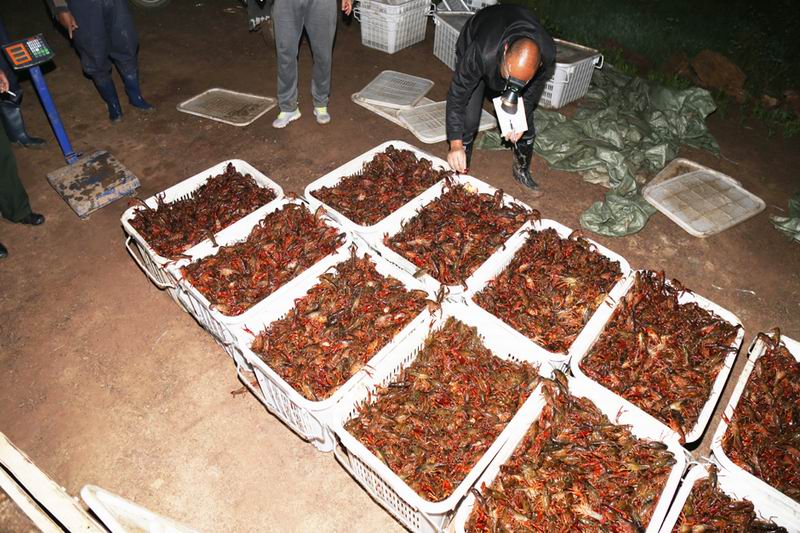 513凌晨,华阳河农场一场职工杨全红承租的1367亩稻虾田里一派繁忙,20多名农工正在捕虾,当天捕获的5000斤龙虾,要在早7点前装车发往湖北,收入近7万元。