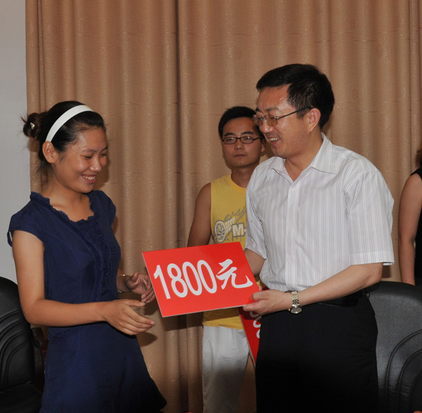 池州学院领导在欢送会上为甘姣龙颁发志愿者生活补助金
