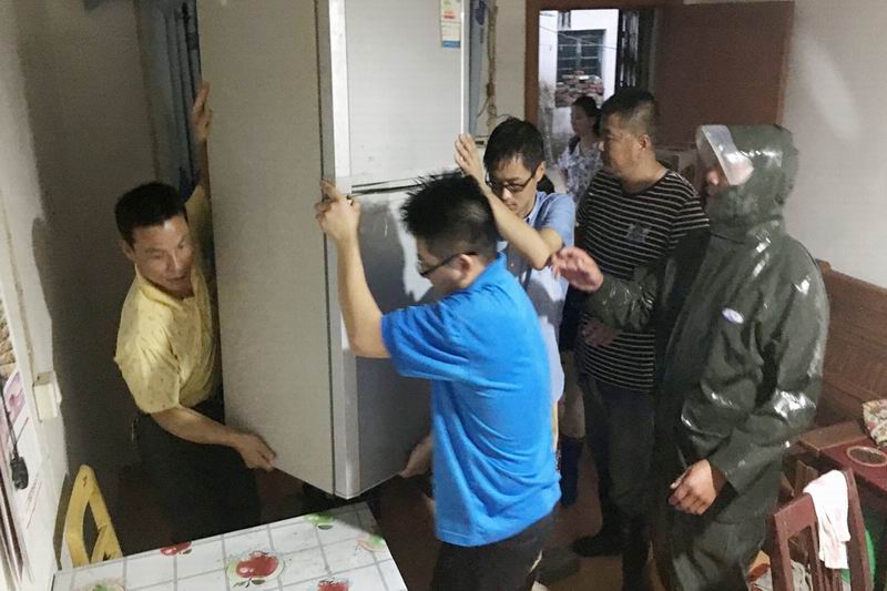 726时许,连续的大暴雨导致二分场华兴小区部分民房积水达10cm,农场党委书记王洪、副场长吴伟率青年党员突击队迅即冒雨赶往受灾群众家中,副场长倪建忠随后也赶到了现场。他们帮助受淹群众搬运家中冰箱、洗衣机等贵重物品,有的肩扛手提,有的合力搬运。这时一位80多岁的老太,家中积水较深,情况相当危急,场领导要求必须连夜把她转移到安全地带,青年党员黄欢背起老太就走。随后又有两位青年搀扶着另一位80多岁的独住老人走到高处,并用小车送到了招待所安顿下来,第二天老人的表侄又把他接往合肥。