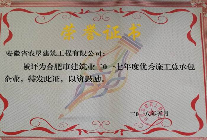近日,合肥市城乡建设委携手市建筑工程协会举办全市建筑业2017年度先进表彰活动,垦建公司被授予优秀施工总承包企业”“优秀劳务企业等多项荣誉称号。