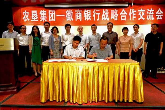 718下午,安徽农垦与徽商银行再度携手举行高层交流会,进一步巩固和加深银企战略合作。省农垦集团董事长田文俊、徽商银行董事长李宏鸣到会作讲话,省农垦集团总经理李卓民、副总经理程军、总会计师高有荣和徽商银行副行长王贵生出席会议,双方相关部门及旗下有关企业负责人参加会商。
