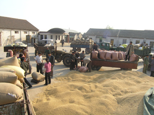 说明:潘村湖农场今年秋季大豆喜获丰收,产量水 平创建场50年来最高。广大农工丰收不忘集体,踊 跃缴纳秋粮。到11月19日,全场已完成计划任务的 92%%。其中二分场、六分场在全场率先完成了产品上 缴任务。图为职工交粮场景。(杨登宏摄)
