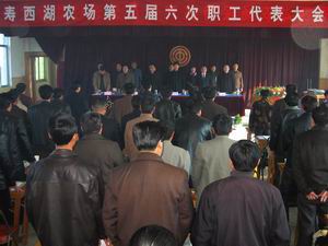 在全国上下深入开展“保持共产党员先进性教育” 活动的热潮中,3月20日,寿西湖农场五届六次职 工 代表大会在雄壮的《国歌》声中胜利召开。大会的 主题是:进一步贯彻落实省农垦工作会议精神,回 顾总结2004年度工作,明确2005年工作目标。