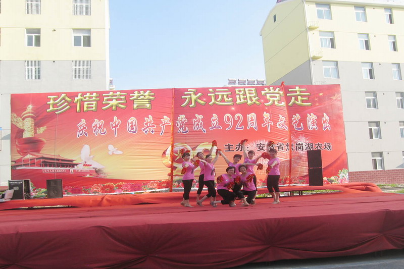 七月的天空流光溢彩,七月的大地笑语欢歌。为纪念党的92岁华诞,讴歌党的丰功伟绩,弘扬时代主旋律,71日下午,安徽农垦焦岗湖农场在场部和“夏丽花园”职工小区各举办了一场庆“七一”文艺演出。广大职工群众争相前往现场观看,垦区兄弟农场、淮南市夏集镇领导纷纷到访祝贺。