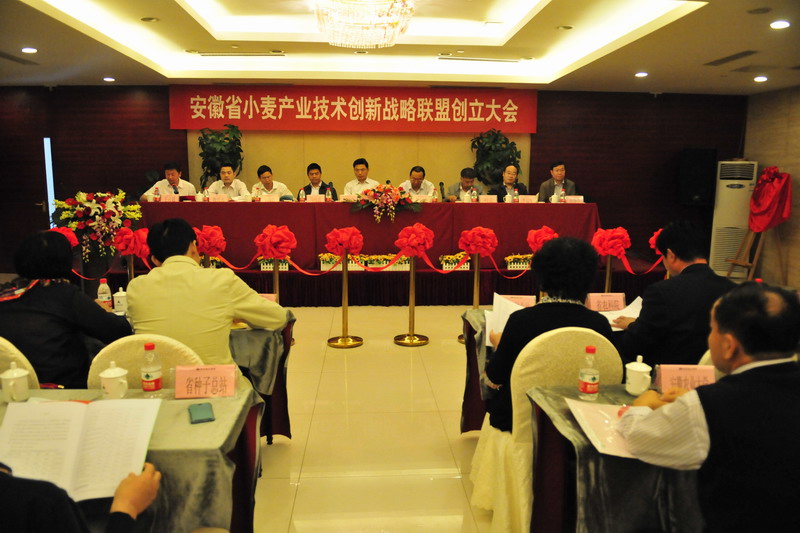 20121014,由皖垦种业股份有限公司发起的安徽省小麦产业技术创新战略联盟创立大会在合肥召开。大会由省种子管理总站赵德平研究员主持,揭牌仪式由皖垦种业总经理王占廷主持,省科技厅副厅长刘明平、省农垦集团总经理李卓民为联盟揭牌,安徽农业大学黄正来教授作联盟议事报告。省农垦集团、省科技厅、省发改委、省财政厅、省国资委、省农委、省农科院、安徽农业大学、安徽科技学院、皖垦种业股份、国元农业保险以及合肥市、瑶海区等单位领导专家和全省小麦产业相关科研院校、种子企业、加工企业、专业合作社等27家成员单位参加创立大会。
