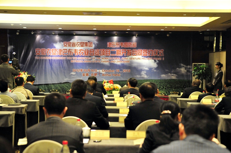 1016,安徽农垦津巴布韦农业合资项目二期开发合同签约仪式在合肥黄山大厦隆重举行。省长助理邵国荷和农业部农垦局、省商务厅、省发改委、省国资委、省农委、省外办、省农垦集团等相关单位领导同志出席了签约仪式。