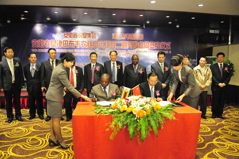 安徽农垦201012月在省政府与津巴布韦政府签署双方合作谅解备忘录的基础上,与津巴布韦政府签署农业合作协议,成立合资公司,合资项目于20113月正式立项实施。项目将在津巴布韦分期开发50万公顷土地,去年首期建立了3个示范农场,开垦土地5000公顷,试种的小麦、大豆、玉米、烟叶等农作物都喜获丰收,在当地起到了良好的示范作用。此次签约的二期合同,投资额预计达15亿元人民币,农作物种植面积扩大至5万公顷,这将进一步扩大项目的影响力,带动更多皖企走出去发展。(杨涛