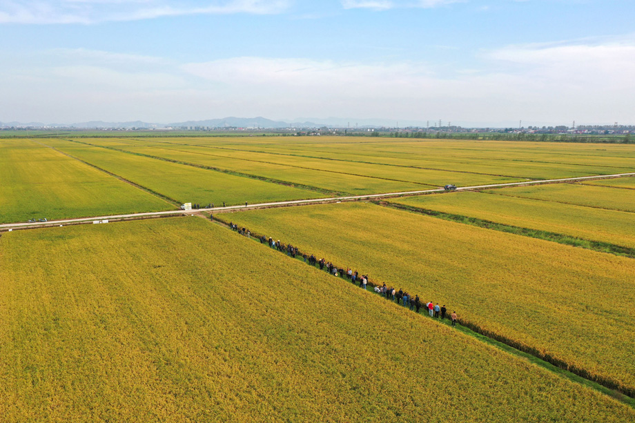 10月10日,华阳河农场公司组织种粮大户、农技人员和社会化服务单位等近百人,到农场统一经营高产示范田观摩成熟期水稻的生长情况。