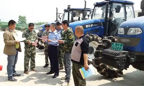 在农机大院现场,监理人员有序安排拖拉机驾驶员进行年检,将登记、检验、签章、反光贴等工作集中实行一站式服务,并结合年检审工作,与农机手签订安全生产责任状,宣传安全生产法律法规,讲解农机安全使用及维修保养知识,此举深受全场农机手欢迎