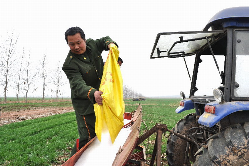 228下午,潘村湖农场二管区职工范刚正在田间追施小麦返青拔节肥。2月下旬以来,该农场广大职工家庭农场在农技人员指导下,抓住当前有利时机,积极开展田管作业。31,全场3.2万亩小麦已普遍追施了一遍返青拔节肥。(杨登红)