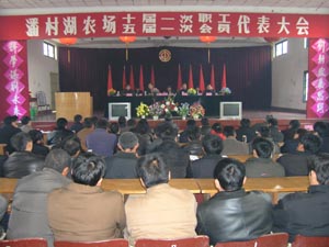 为期2天的潘村湖农场十届一次职工代表大会暨五 届一次会员代表大会于2月26日下午胜利闭幕。会 议期间,与会代表听取和审议了韩大鸣场长做的 《场长工作报告》等大会各项报告,并以举手表决 的形式一致通过了相关决议。大会以代表无记名投 票的方式差额选举产生了潘村湖农场第五届工会委 员会。会上举行了集体合同签字仪式,工会主席林 贤传代表全场职工与韩大鸣场长签定了2006年度集 体合同。会议还对2005年度先进单位和个人进行了 表彰。本次大会期间,韩大鸣场长向全体代表传达 了省农垦工作会议精神,陶卫东副场长摘要领读了 田文俊总经理在农垦工作会议上做的报告。图为大 会场景。(杨登宏摄)